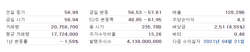 한국투자증권의 회사 요약내용과 investing.com의 주식정보를